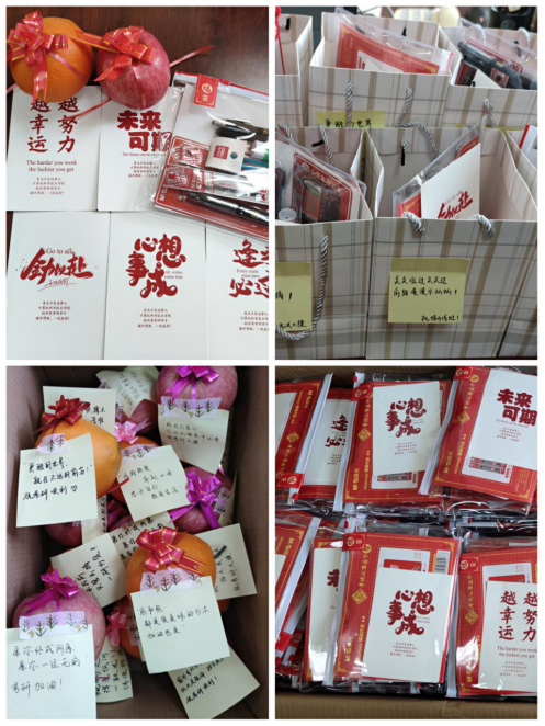 辛克恒、姜彬、陶晓赟及员工会成员为同学们送上“一研为定”考研大礼包和老师、学弟学妹亲手写的祝福。一份温暖的礼包,凝聚着学院领导的关怀与挂念,珍藏着公司师生对考研学子的美好祝愿。