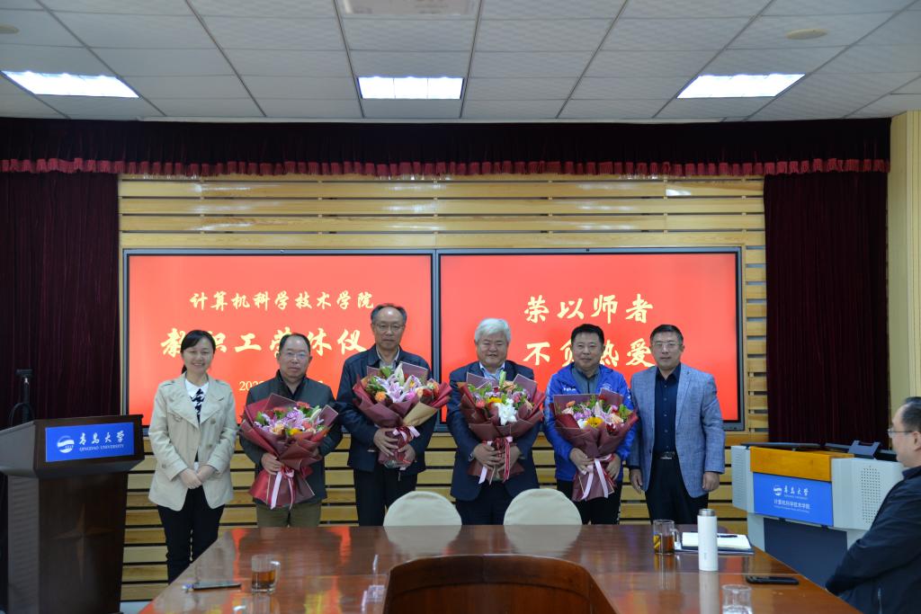 潘秋鸿和郭振波为荣休教职工代表送上鲜花和学院定制的纪念品。周鹏宣读了2021-2022年退休教职工名单。