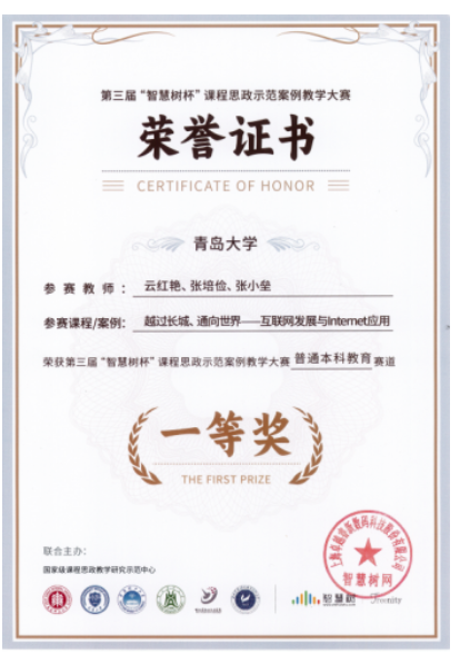 2023年8月,在第三届全国“智慧树杯”课程思政示范案例教学大赛中,经过初赛、复赛两轮评选,公司云红艳、张培俭、张小垒教师团队以“越过长城、通向世界——互联网发展与Internet应用”为题荣获普通本科教育赛道一等奖。