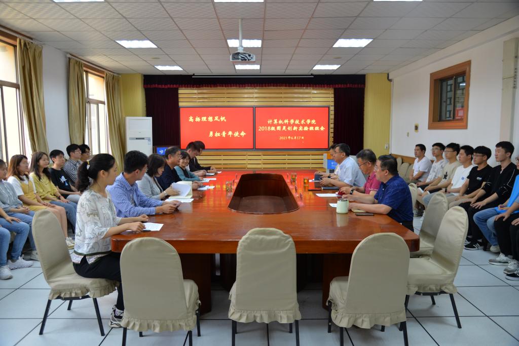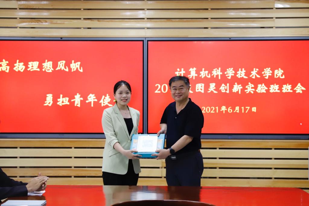 图灵创新实验班班长梅杰从思想建设、学风建设、创新竞赛、社会实践、志愿服务、团建活动等六个方面介绍了一年来创新实验班取得的各项成绩;曹阳、赵新鹏、王文涵三位同学围绕自己在学习、竞赛、科研、社会服务、公益活动等方面的经历和收获分别作了交流发言;姜旭阳同学代表全班同学向董事长赠送了班级纪念册和学院文创产品。